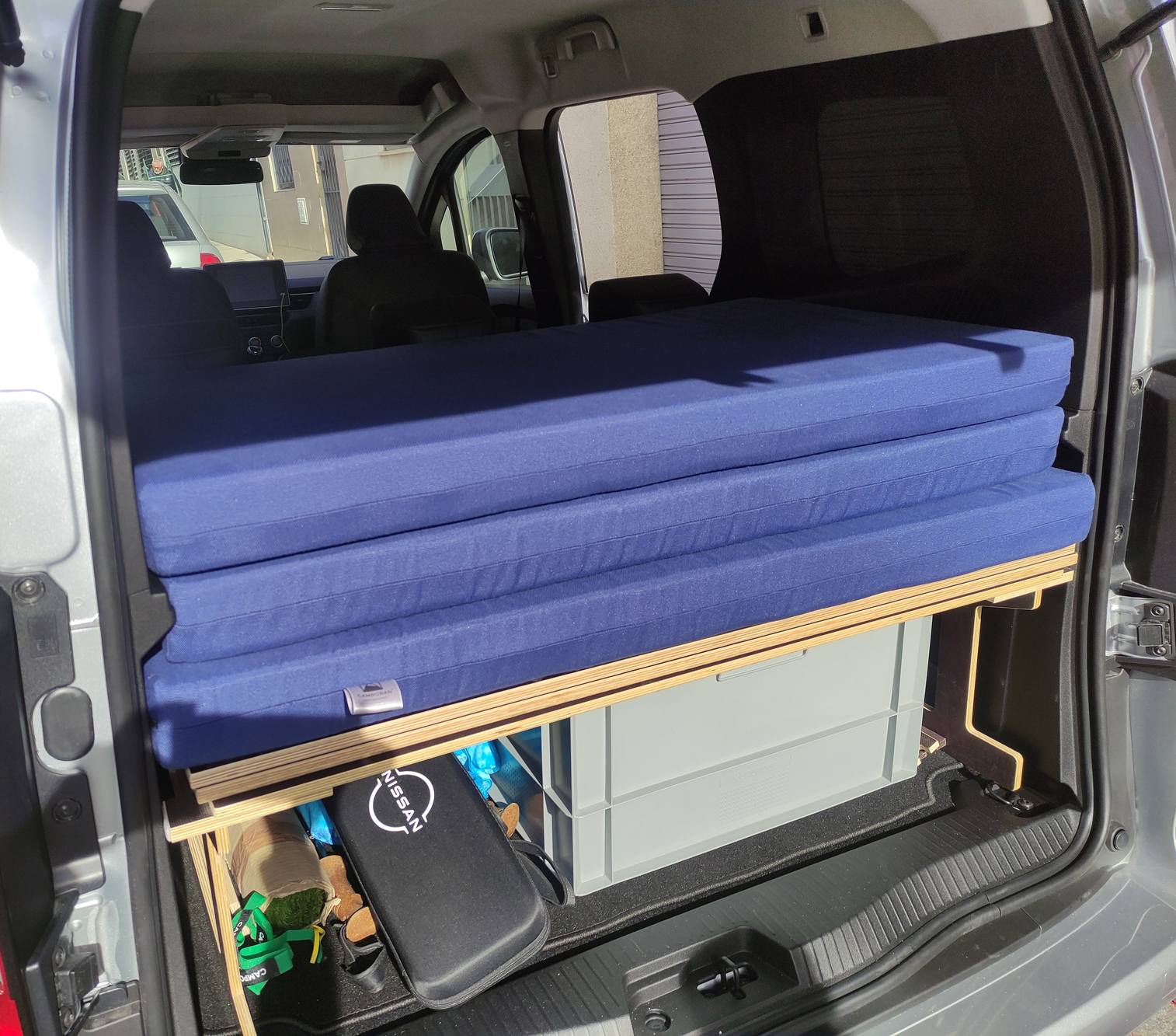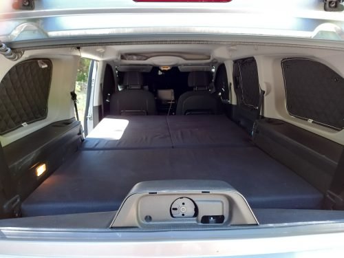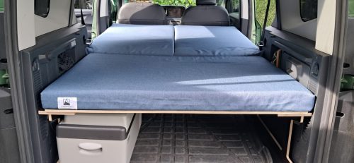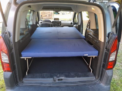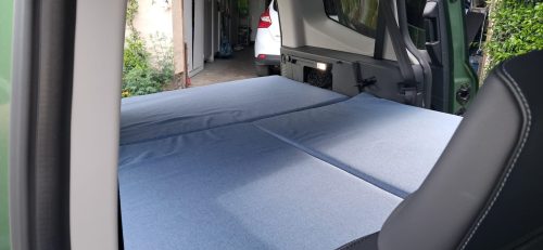 Està format per una peça per a la zona del maleter, de 71x119x8cm, i una altra en forma de llibre de 115cm per 130cm dample; així es pot dormir còmodament aprofitant l’amplada més gran d’aquesta zona de la furgo. Escuma de densitat 25Kg/m³ (ferma) i 8cm de gruix. Grossor total en maleter o plegat: 24cm.
