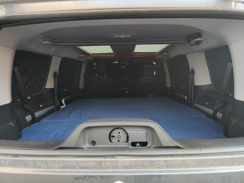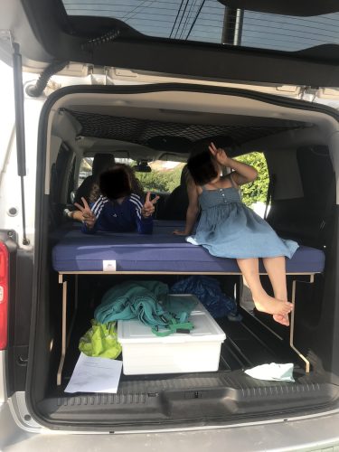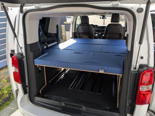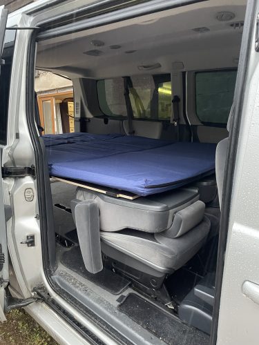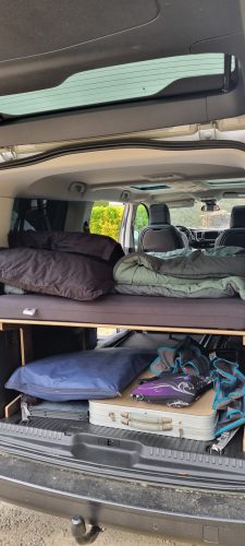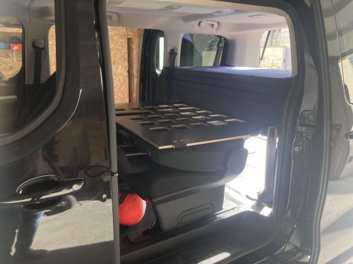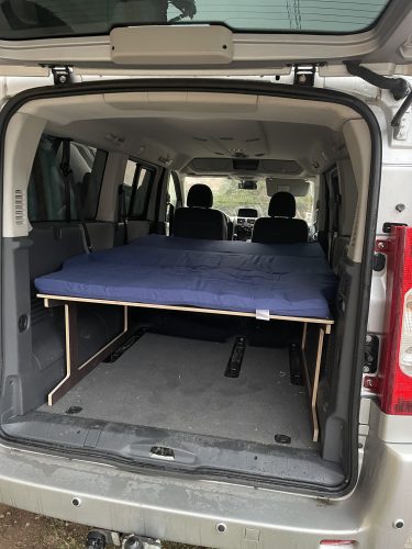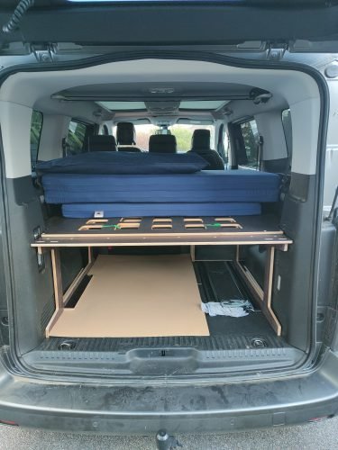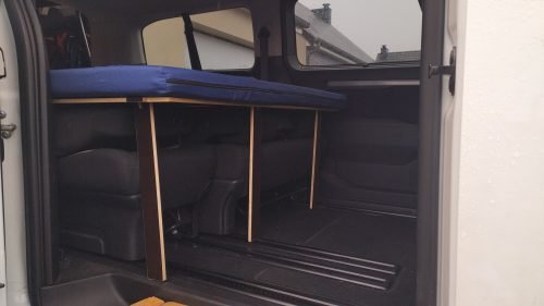 - The frame structure is made up of 3 pieces, one of which slides forward on the second row seats tilted forward. 4 legs are supplied, in case you prefer that the bed base does not touch the seats, or if you want to remove these seats to have more cargo space.