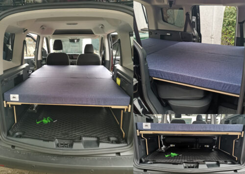 téléphone David. 10 jours après, je recevais mon colis : l'ensemble cadre de lit en contreplaqué bouleau marine 9 plis, stratifié sur les deux faces, alliant légèreté et rigidité (adaptable sur les deux véhicules cités) + matelas + rideaux occultant taillés sur mesure selon modèle (vitre hayon arrière relevable ) livraison comprise pour environ 1000 euros. Le tout monté, démonté en 2 minutes, tient dans le coffre une fois les sièges arrières dépliés. Ya pas photos (il y en a suffisamment). Au Top . Encore quelques progrès à réaliser en français , David pour avoir la sixième étoile.